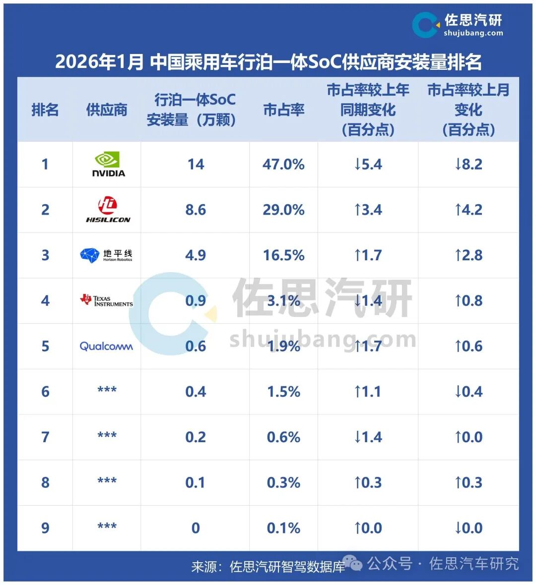 2026年1月 行泊一体SoC安装量超29万颗,头部供应商集中度超90%