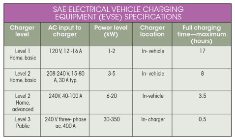 汽车工业和汽车工程师协会(SAE)已经为电动汽车充电器建立了一些正式的标准,通常被称为电动汽车供应设备(EVSE)。下表总结了这些类型的充电器。