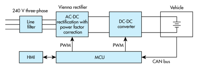 下图显示了一个通用的架构,可以把它想象一个3级充电器。它从电网接收三相交流电,对其进行过滤,然后提供功率因数校正(PFC),使交流电整流成直流电。DC-DC转换器开发所需的高压直流连接到电池上。嵌入式MCU控制整个系统,包括PFC、整流器和转换电路的门驱动器。这是一个简单的介绍,实际的电路要复杂得多。