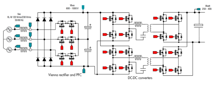 此图显示了双有源全桥单相DC/DC变换器(DAB)的组成,左边是维也纳的高压桥整流器/ PFC (700 - 800 V),右边是电源电路, 为电池充电(380 - 500v)。这样的安排可使叠加转换器实现高功率输出,并提供双向操作模式,支持电池的充放电应用。