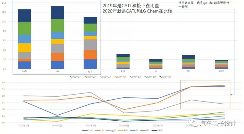 SNE 研究更新了 7 月份全球的动力电池的装机量排行,赌对欧洲和 Tesla 需求的 LG Chem 继续高歌猛进,7 月份动力装机量装机量 2.8GWh,同比增长 171.5%;1-7 月份装机量 13.4GWh,增长了 97.4%,从去年第四位跃居第一位。结合之前韩国研报对 LG Chem 的 Q2 的财务报告和 QA 我们整理一下重要的信息。过几天,欧洲和中国 8 月份的新能源汽车的数据也要出来了,到时候再放在一起看看。