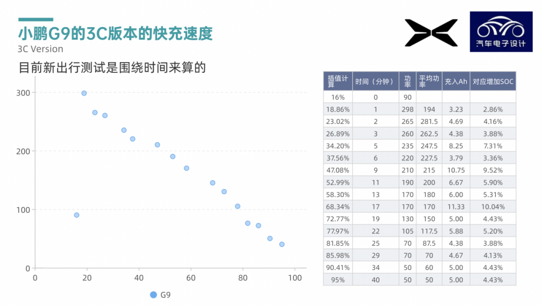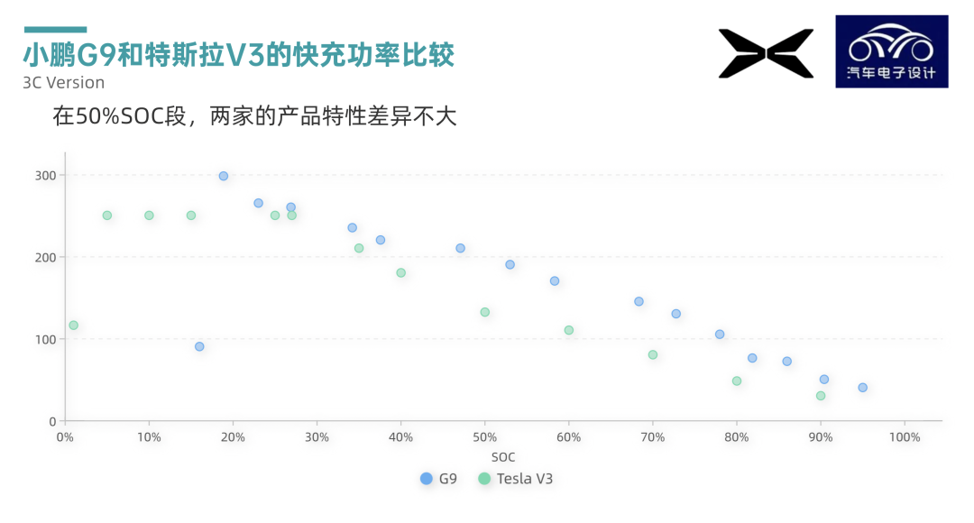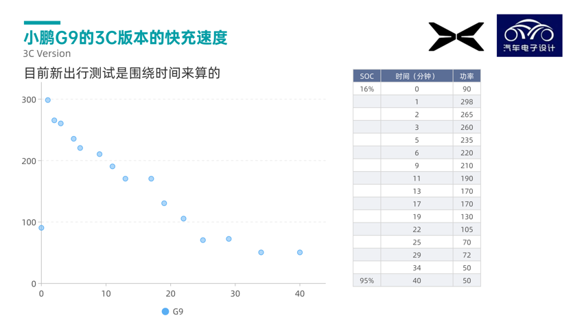 如果我们拿这个数据和特斯拉的Super Charging V3来做个对比,这两个电池分别是98kWh和81kWh。目前来看,低SOC段,由于特斯拉特殊的加热机制,整个快充功率和倍率,特斯拉略胜一筹;而在50%以后,G9的3C版本是略胜一筹的,但是也不算是很多吧。
