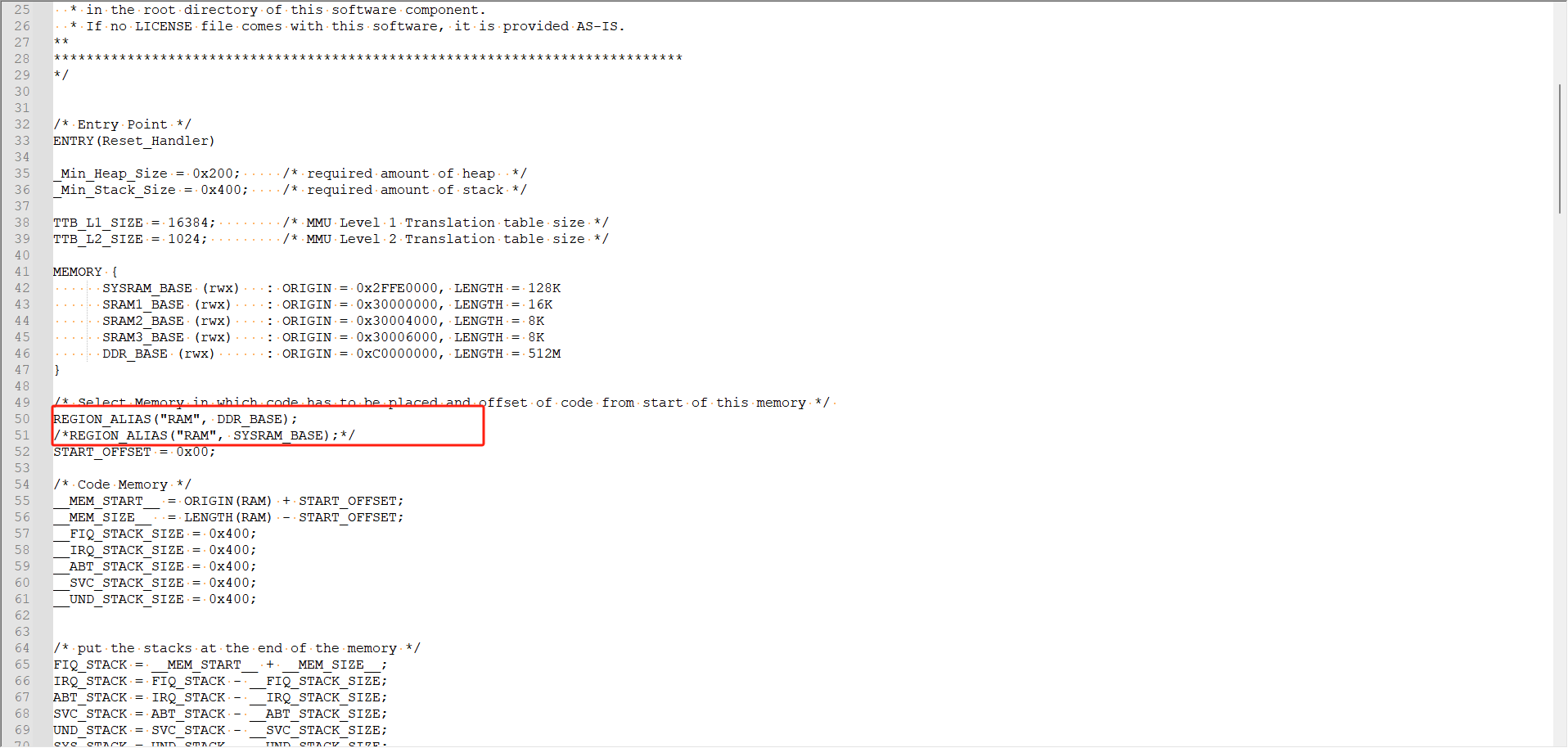 将REGION_ALIAS('RAM', DDR_BASE);部分的注释删除,再把REGION_ALIAS('RAM', SYSRAM_BASE)给注释掉,保存并选中: