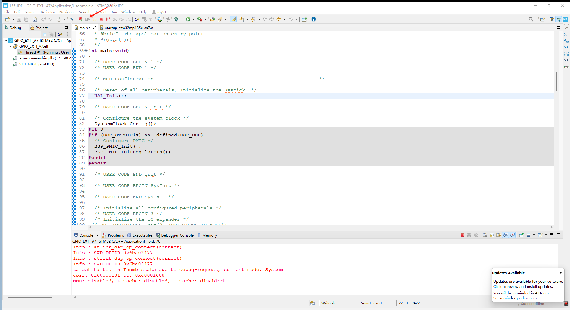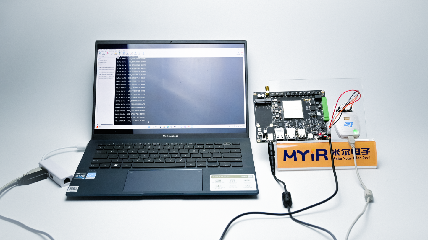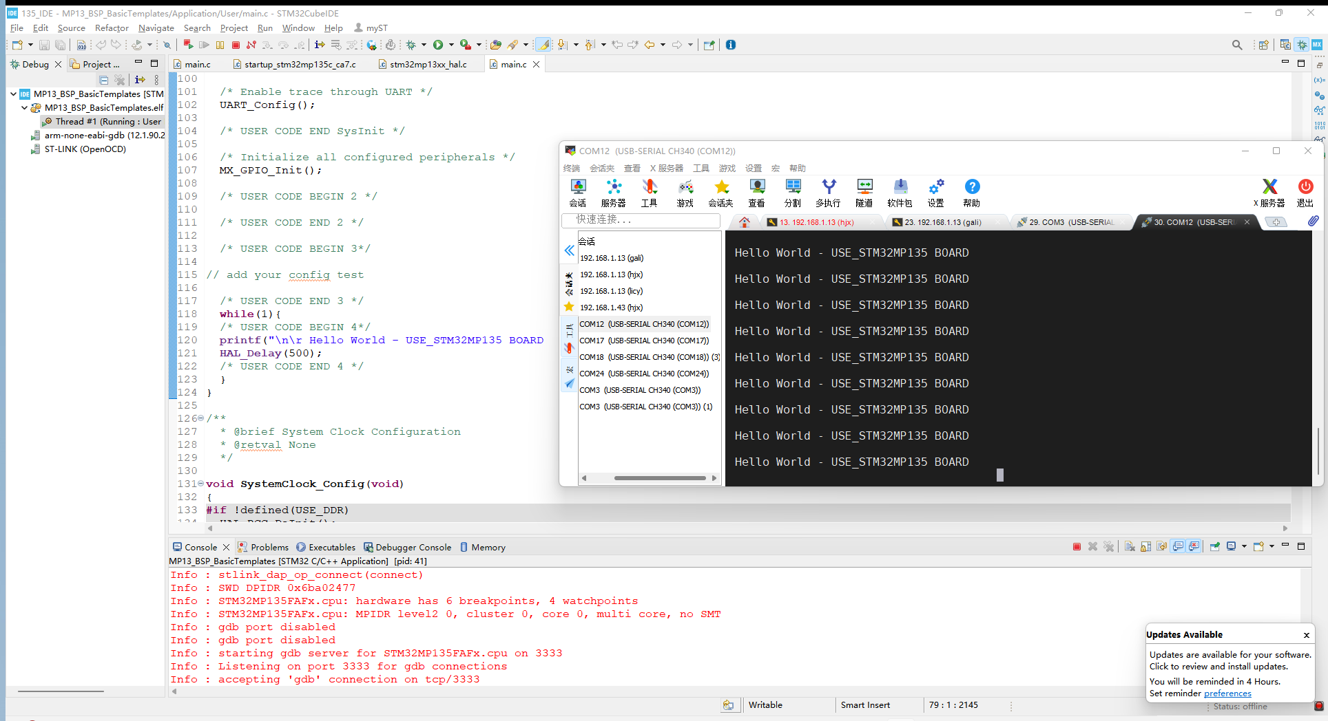 将开发板接上串口,全速运行,串口会打印Hello World - USE_STM32MP135 BOARD,至此应用调试成功。