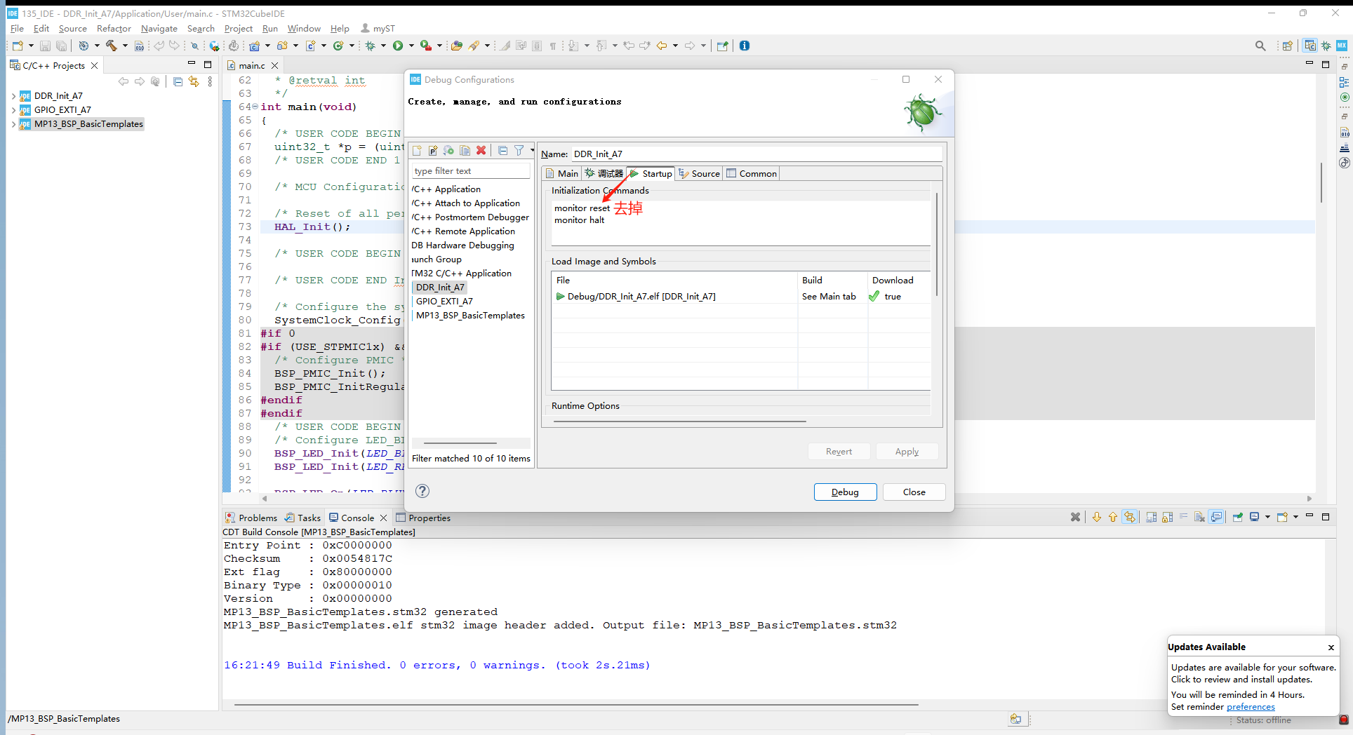 将以上环境配置完成之后,在应用调试阶段也需要进行一个配置,打开工程的调试设置界面,点击startup,将monitor reset删除,保存并调试: