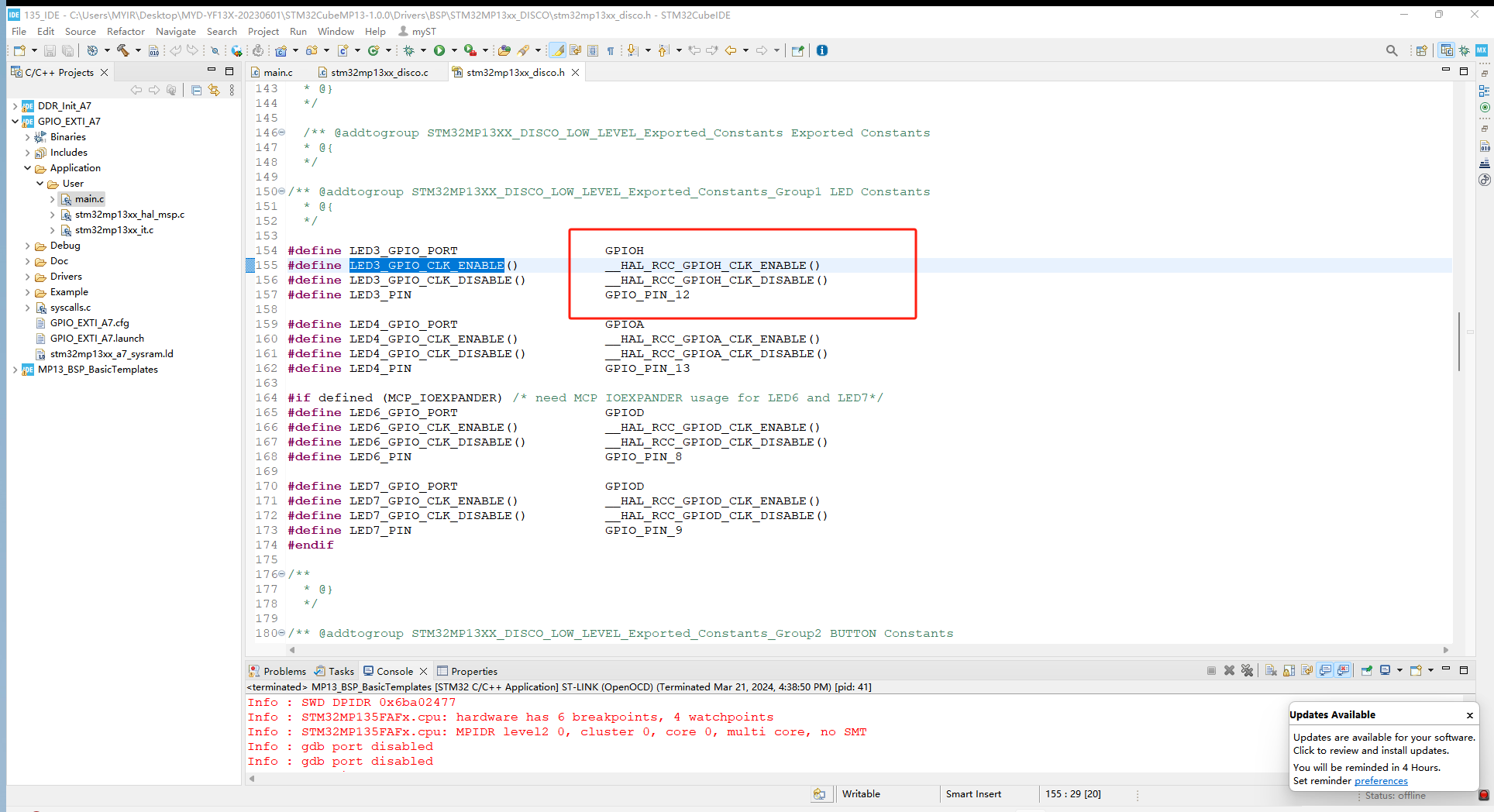开始对心跳灯进行配置,修改stm32mp13xx_disco.h里的心跳灯引脚配置: