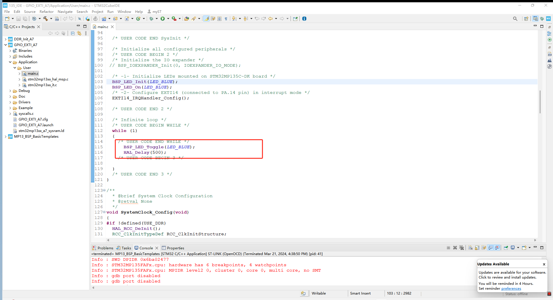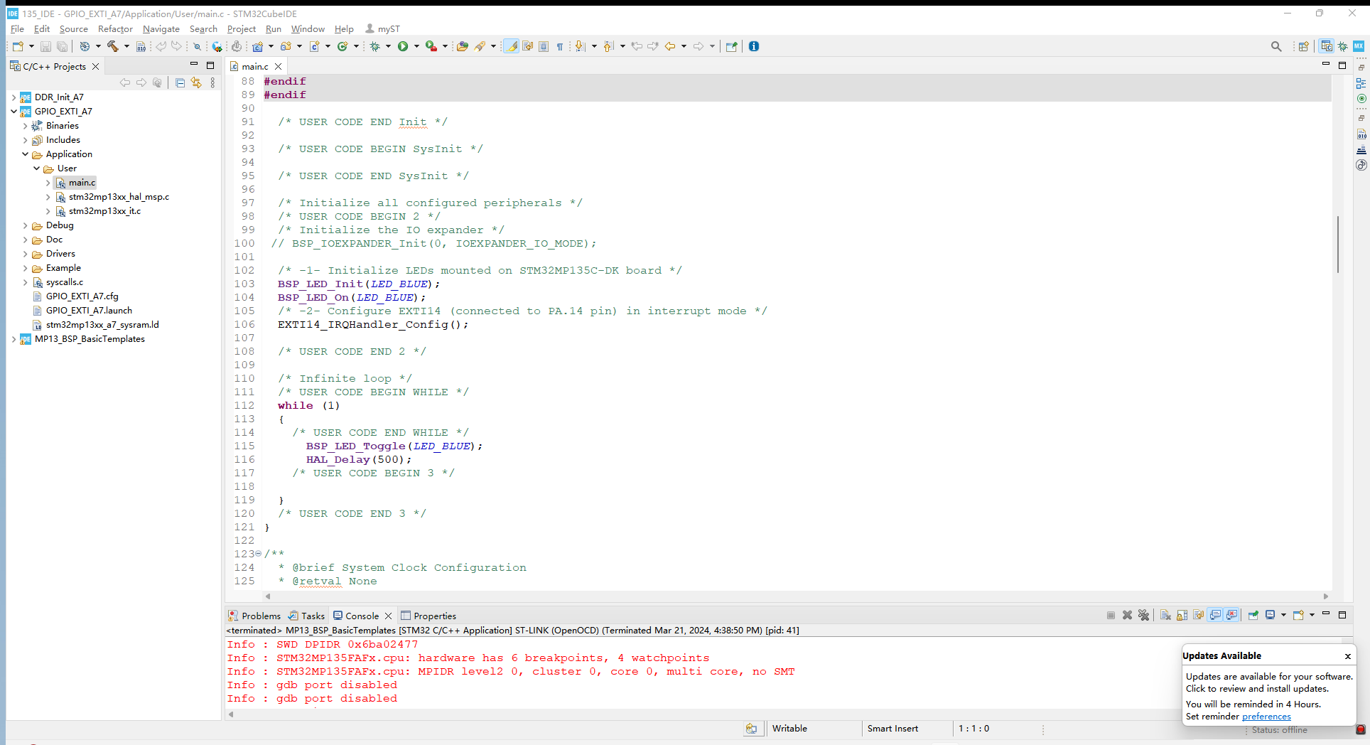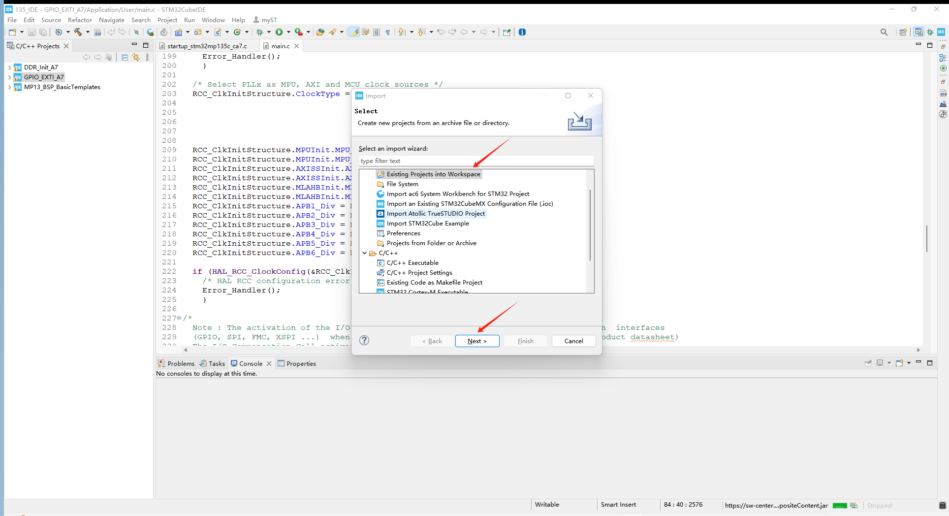 米尔创建的工程位于STM32CubeMP13-1.0.0ProjectsSTM32MP135C-DKExamplesGPIOGPIO_EXTI路径下,根据1.1中的方法导入工程,如下: