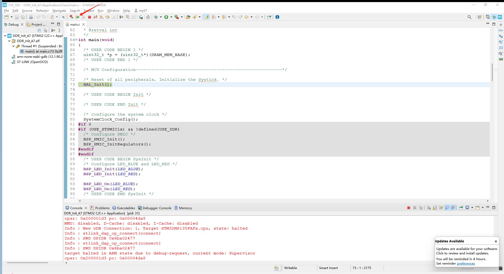 进入到界面之后点击全速运行,看到开发板的蓝灯在闪烁说明ddr初始化成功: