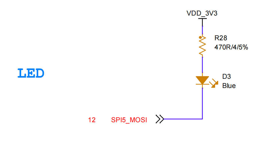 以米尔MYD-YF13x开发板上的心跳灯为例,首先要确定心跳灯用到的GPIO口。查看硬件原理图可以看到心跳灯连接的是SPI5_MOSI: