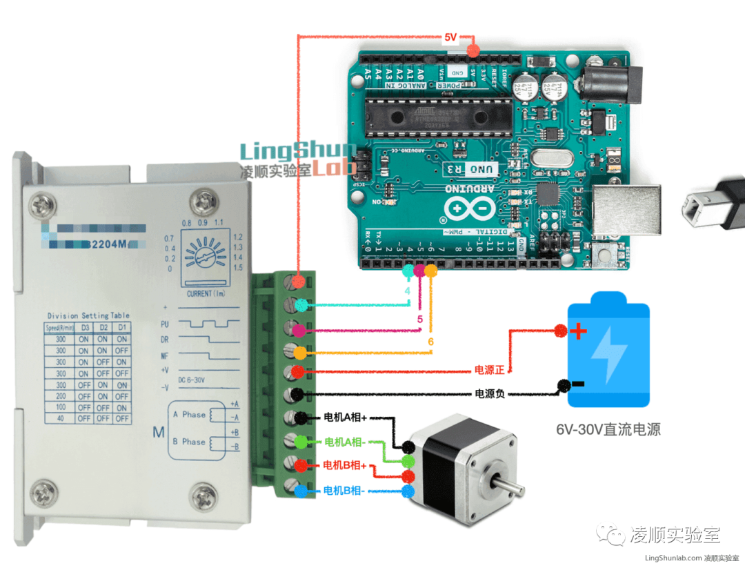 | 2204M 驱动器 | Arduino Uno | 步进电机 | 6V-30V电源 | |||