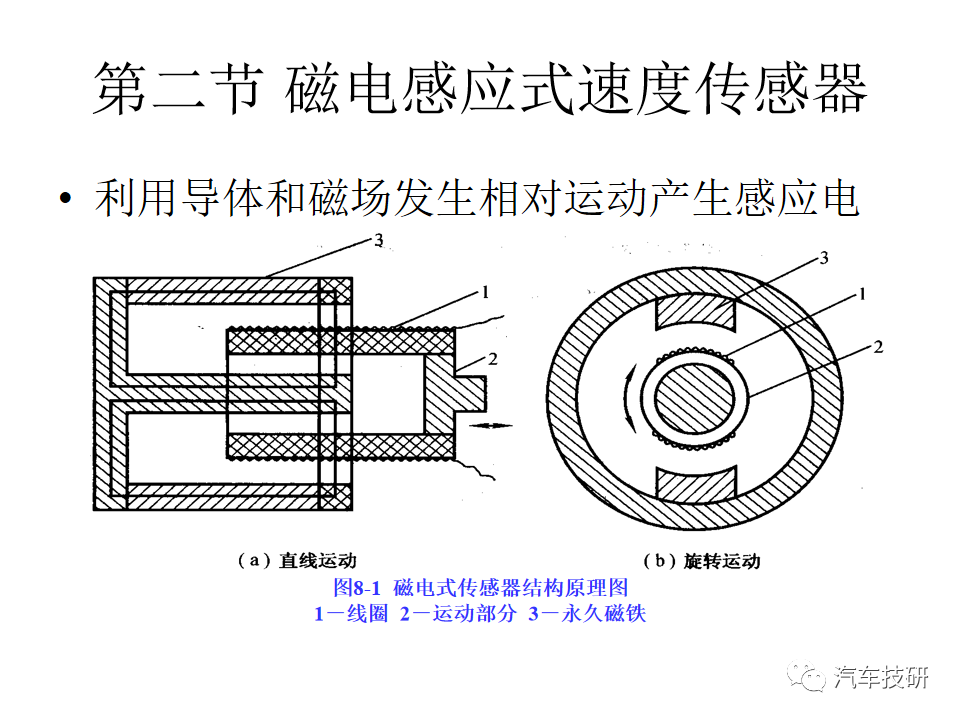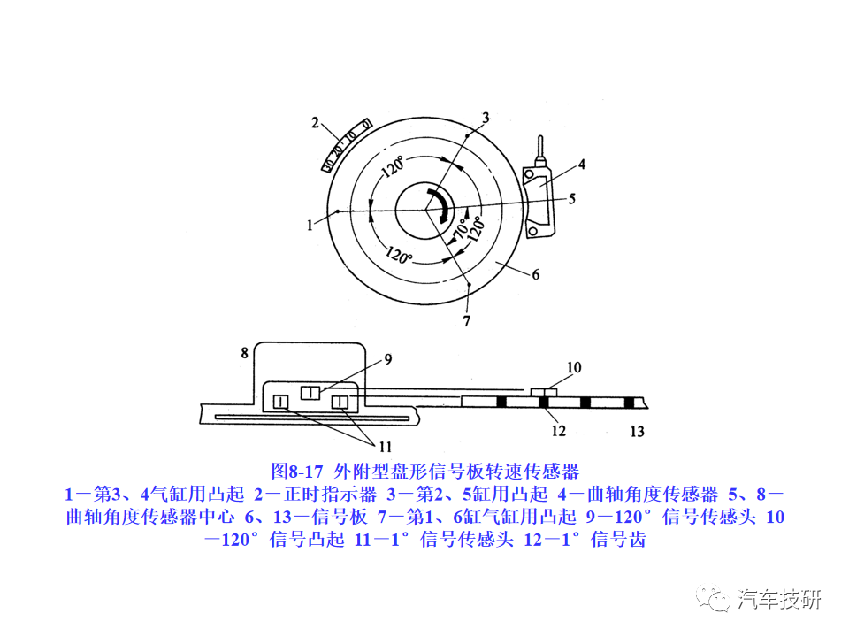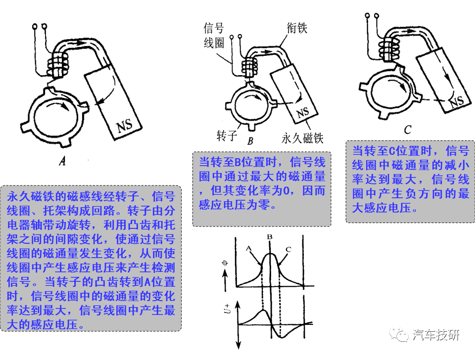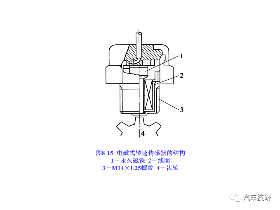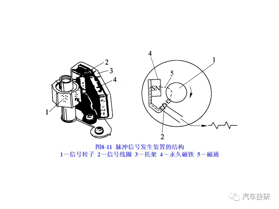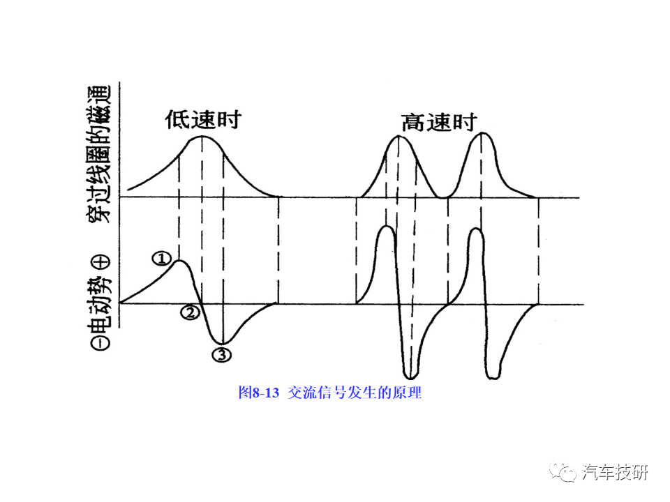 功能:感应式转速传感器跟脉冲盘相配合,用于无分电器点火系统中提供发动机转速信息和曲轴上止点信息。 原理:与脉冲盘配合使用。脉冲盘是一个齿盘,原本有60个齿,但是有两个齿空缺。脉冲盘装在曲轴上,随曲轴旋转。当齿尖紧挨着传感器的端部经过时,铁磁材料制成的脉冲盘切割传感器中永久磁铁的磁力线,在线圈中产生感应电压,作为转速信号输出。 传感器针脚定义:1#19#接地(屏蔽); 2#48#接地; 3#49#传感器信号输出 简单测量方法: 1、在发动机无法启动时,连接发动机诊断仪,在运转启动电机的时候查看转速参数是否正常。 2、(卸下接头)把数字万用表打到欧姆档,两表笔分别接传感器2#、3#针脚,20℃时额定电阻为860Ω±10%。