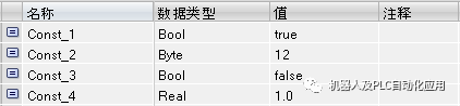 在“变量”(Tags) 选项卡中声明程序中所需的全局 PLC 变量。下图显示了该选项卡结构。所显示的列编号可能有所不同。