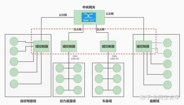 a.在基于域控的集中式架构之下, 各个功能部件均成为独立的域, 在每个域之下有相应的控制功能集合。域与域之间可以做到安全隔离, 也可以根据需求进行通信和互操作, 形成类似以太网总线上的计算机局域网, 变成了松散耦合的架构。各域控制器完成各自的的数据处理, 并在域本地完成决策, 只通过中央网关与其它域控制器交换所需数据。其中, 与自动驾驶相关的传感数据由自动驾驶域控制器处理后进行决策。