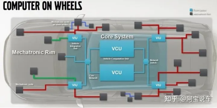 沃尔沃的区域电子电气架构包括 Core System(核心系统) 和 Mechatronic Rim(机电区域) , 如下图 所示。沃尔沃的 VIU(Vehicle Integration Unit, 整车集成单元) 对应不同整车区域的感知、 控制与执行。沃尔沃的 VCU(Vehicle Computation Unit, 整车计算单元/整车控制器) 对应车载中央计算机, 提供整车智能化所需的算力与数据存储。