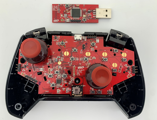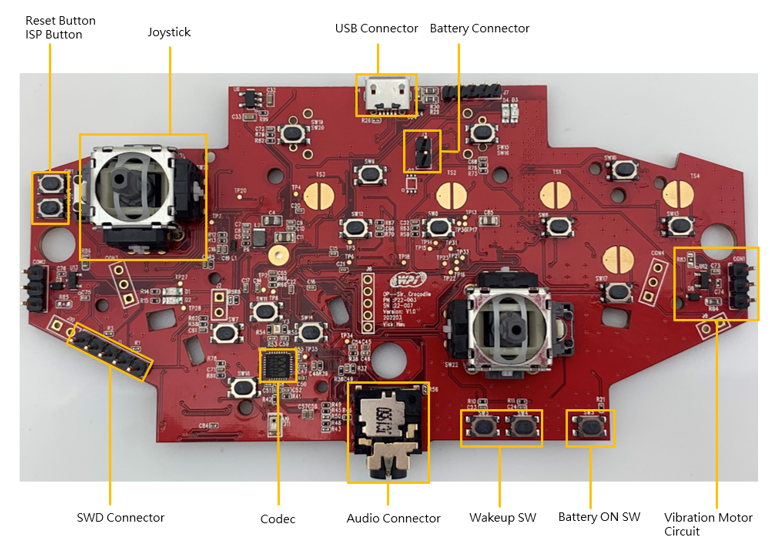 4. 方案模组板的拥有 13 个 button、2 个 Joystick ( 16 bit ADC )、2 个 RT、LT 16 bit ADC button、2 组 震动马达输出端口、1 组 Audio、Microphone、1 组陀螺仪、加速计。