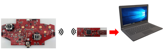 当按压无线搜寻按钮时,摇杆端 MCU 会传输讯号给 NXH3670,透过NXH3670 无线功能搜寻是否有 Dongle 端讯号可配对,若有收到 Dongle 端回传的无线讯号则切换为无线模式。