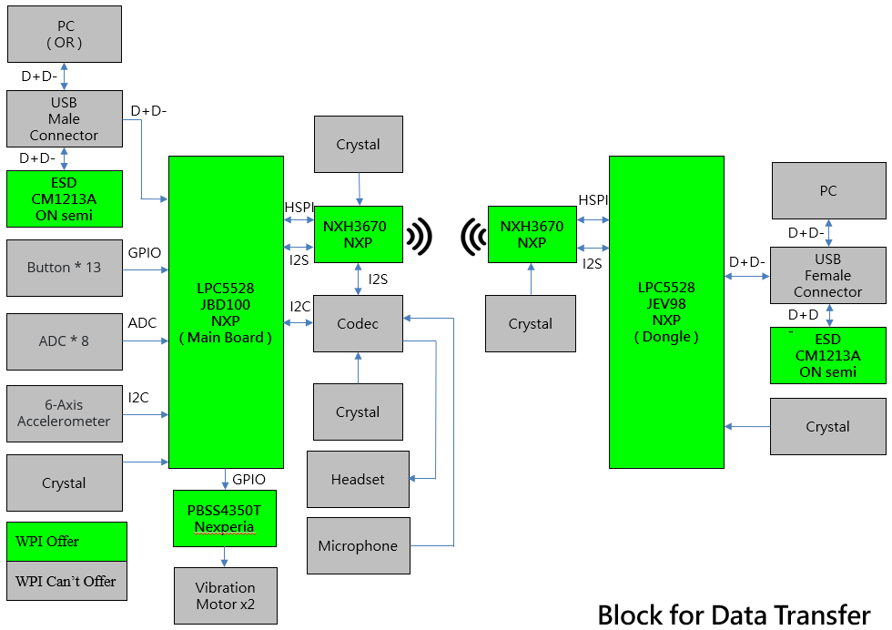 3. 方案模组板的 Main Board 与 Dongle 透过NXH3670 以无线方式传输讯号。