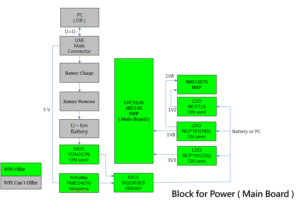 2. 方案设计模组板中透过 Battery Charger IC、Current Protection IC、MOS ( FDN357N、SQ2303ES )、Schottky ( PMEG4010BEA ) 规划出充放电回路,可透过锂电池对模组板供电,当锂电池电源不足时,亦可透过 PC 端的 USB 电源供电,并对锂电池充电。