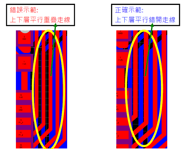 上下层走线尽量不要平行重叠走线,避免CROSS TALK。