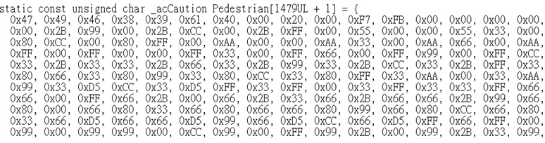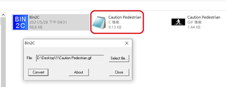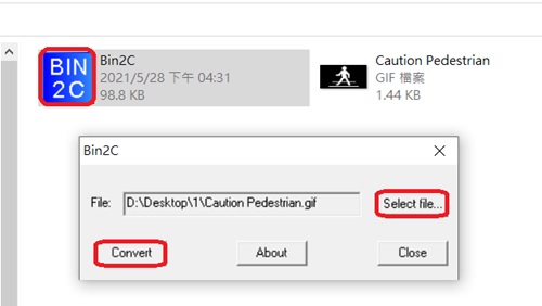 Step1: 开启 BIN2C 应用程式, 点选 'Select file”, 选择GIF图档 'Caution Pedestrian.gif?imageView2/2/w/1000'.