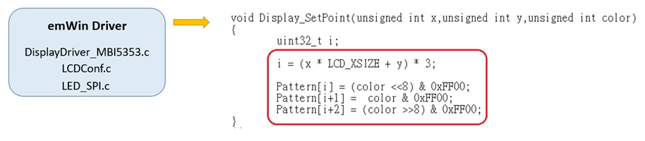 (2) emWin driver, Display_SetPoint()里面, 将要点亮64(x)*32(y)*3(RGB)展示板的资讯存进'Pattern'阵列.