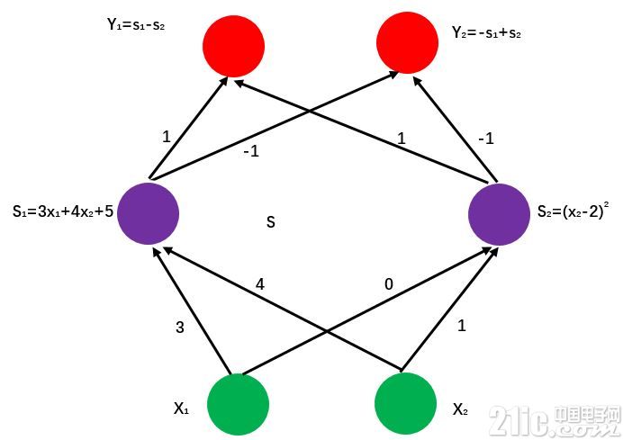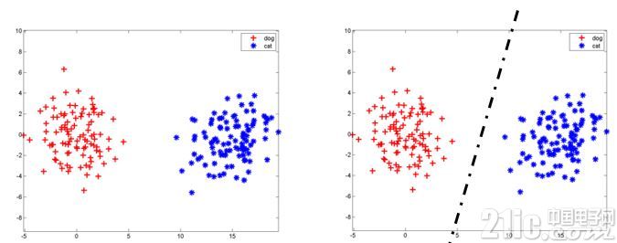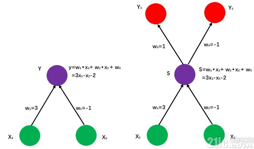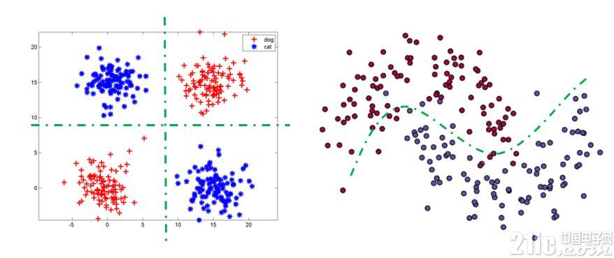 人工神经网络,简称神经网络,是一种模仿生物神经网络的结构和功能的数学模型或者计算模型。其实是一种与贝叶斯网络很像的一种算法。之前看过一些内容始终云里雾里,这次决定写一篇博客。弄懂这个基本原理,毕竟现在深度学习太火了。 神经网络是一种方法,既可以用来做有监督的任务,如分类、视觉识别等,也可以用作无监督的任务。首先,我们看一个简单的例子。如下图所示(这个图网上有很多人引用了,但我找不到出处,欢迎指正),如果我们想训练一个算法可以使其识别出是猫还是狗,这是很简单的一个分类任务,我们可以找一条线(模型),在这个二元坐标中进行“一刀切”,把这两组数据分开。我们知道,在解析几何中,这条直线可以用如下的公式表达: 图1 猫狗数据 图2 一个简单的神经网络 这里的W1和W2就是两个坐标轴上的系数,可以称为权重。W0可以称作截距,也叫做偏移。新来一个数据点,也就是一组输入值(X1,X2),如果在这条线的左边,那么它就是一只狗,如果在右边就是一只猫了。这就可以用一个简单的神经网络来表示。如图2所示,X1和X2分别是输入值,Y是输出值,两条边的权重分别是W1和W2。这是一个最简单的神经网络了。这就是使用神经网络定义了一个线性分类器了。这里的一个圆形的节点就是一个神经元。我们也可以采用另一种方式,即在输入输出之间加一个中间节点S,然后增加一个输出层,包括两个节点Y1和Y2,分别对应猫和狗,最后哪个输出节点的值大,那么这个数据就属于哪个类别(猫或者狗)。 对于简单的二分类问题这就可以解决了。但在实际情况中,有很多问题无法简单的使用“一刀切”的方式解决,如图3所示,假设猫和狗的数据分布如下图,那么这就无法用“一刀切”的方式来解决了,但是我们可以切两刀,横竖各一刀,然后把相同的“块”联合起来,这样就解决了比较复杂的分类问题了。也有些问题,需要用曲线来分割。在这种情况下,我们就需要比较复杂一点的神经网络了。以曲线为例,我们可以设计出一个三层的神经网络。这就是用神经网络设计的一个非线性分类器。理论上讲,如何一个分类器都可以设计一个神经网络来表征,也就是说,不管实际图形如何,我们都可以设计一个神经网络来拟合。到这里,可能有人问,每个节点的这个函数要如何选择?根据吴军老师《数学之美》第二版中的说法,为了提供人工神经网络的通用性,我们一般规定每个神经元的函数只能针对其输入的变量做一次非线性的变换。举个例子说就是假如某个神经元Y 的输入值是X1,X2,...Xn,它们的边的权重分别为W1,W2,...Wn,那么计算Y节点的值分两步进行,第一步是计算来自输入值的线性组合: 第二步是计算y=f(G),这里的f(⋅)可以使非线性的,,但因为里面的参数是一个具体的值,所以不会很复杂。这两个步骤的结合使得人工神经网络既灵活又不至于太复杂。这里的f(⋅)就是激活函数。线性模型的表达能力不够,它的作用就是来增强模型的表示能力。人工神经网络可以很多层连接在一起,因此在人工神经网络中,主要的工作就是设计结构(基层网络,每层几个节点等)和激活函数。我们常用的激活函数包括Sigmoid函数、ReLU函数、Tanh函数等等。如下图所示,这是几种简单的激活函数的示意图( https://ypwhs.gitbooks.io/nnplayground/content/Activation.html )