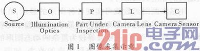 机器视觉是计算机科学的一个分支,是用机器代替人眼做各种测量和判断。一个典型的机器视觉系统包括图像采集、图像处理、运动控制部分等。图像采集是一个重要的环节,它将被测物的可视化图像和特征转化为能被计算机处理的一系列数据。图像采集部分由光源(S)、光学照明系统(O)、被测物(P)、镜头(L)、摄像机(C)构成,采集过程如图1所示。可描述为,在光源提供照明的条件下,被测物的图像经过镜头在摄像机传感器上得到清晰的图像,传感器将图像转换为模拟或数字视频信号,最后通过图像采集卡传输给图像处理部分。