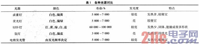 理想的光源应该是明亮、均匀、稳定的。光源种类较多,根据发光器件本身可以分为卤素灯、荧光灯、LED灯、氙灯等,表1列出了几种主要光源的相关特性。