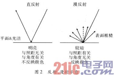 利用被测物及其背景对光的反射和传送特性的差异进行光源照明设计,能够强化被测物和背景的对比度,即提高图像效果。主要考虑两个特性:(1)反射特性。物体反射光线有两种不同的反射特性:直反射和漫反射。直反射:光线的反射角等于入射角,直反射有时用途很大,有时又可能产生极强的眩光。在大多数情况应避免镜面反射。漫反射:照射到物体上的光从各个方向漫散出去。在大多数实际情况下,漫散光在某个角度范围内形成,并取决于入射光的角度。两种反射的示意效果如图2所示。(2)相减色。反射时,从光谱中去除某些波长的光。如白光照射到红色物体后,红色光谱被反射,而其他成份则被物体吸收。