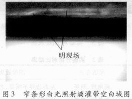 (2)窄直射光照射滴灌带表面,光以反射为主,漫射为辅。分析方法:根据光学原理,用条形白光直射滴灌带空白区域,镜头置在反射光的视野内,若通过摄像机能够观察到明显的“明视场”,则说明胶管表面对直射光线以直反射为主,漫反射为辅。实验效果如图3所示。