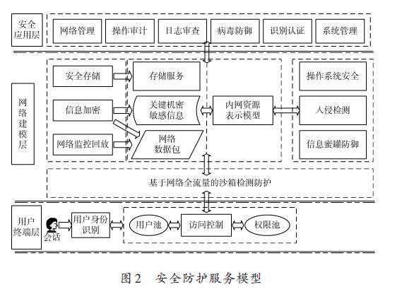 安全应用层是整个安全防护模型的最高层,包括操作审计、日志审查、病毒防御、识别认证、系统和网络管理等相关应用扩展模块。在用户终端层和网络建模层的基础上构建整个安全防护系统的安全防护服务。