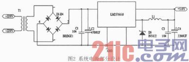 由于本控制系统单元电路较多且对5V电源的要求比较高,其中TC35模块的突发耗电电流峰值可达2.5A,故外加的稳压器件必须达到足以提供TC35和其他电路额定电流的条件。在本系统中,采用了开关电源芯片LM2576完成从12V到5V的转换,作为对TC35终端和其他5V单元的供电。必须特别注意的是,如图2由LM2576芯片完成开关电源转换需要大功率的电感100 μH和电容,以提高储能的能力,达到单元电路的耗电需求。LM2576为5.0V3A开关电源稳压器。