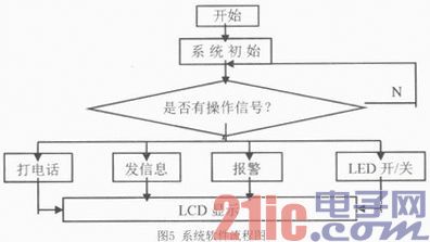 实现功能如图5所示的软件流程图,具体实现过程描述:1)按键拨打相应的电话,测试使用;2)按键发送短消息,测试使用;3)单片机检测玻璃破碎探测器的信号,决定是否报警、发送短消息及给住宅主人打个电话:4)住宅主人短信控制家中的设备,这里仅用LED的亮与灭演示。