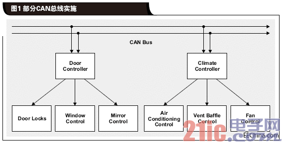 由于越来越多的传感器和处理器不断被加入到这个网络中,总传输速度进一步降低,汽车系统变得更加复杂。图1显示了用于实现车门和温度控制功能的CAN 总线。由于所有这些都是低带宽应用,因此相互干扰并不是一个大问题。但是,如果同一条总线还要处理更高的带宽,如引擎控制等更重要的功能,则需要把车门和温度控制的优先级设为足够的低,以使这些功能不干扰引擎控制。