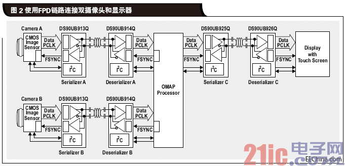 当高带宽和低延迟是最为重要的考虑因素时,应首选FPD链路来实现一些重要的连接。另外,由于可以支持反向通道,并且能够通过单条双绞线对或者同轴线连接来供电,因此布线更加简单。图2显示了一个OMAPTM视频处理器,它连接两个不同的摄像头和显示器,通过单条双绞线对线缆连接外围设备。这种双绞线对线缆支持摄像头视频数据和触摸屏/摄像头设置数据。它还为显示器或者摄像头供电。由于每条链路专用于一个外围设备,因此两个摄像头的信号之间不会出现干扰。
