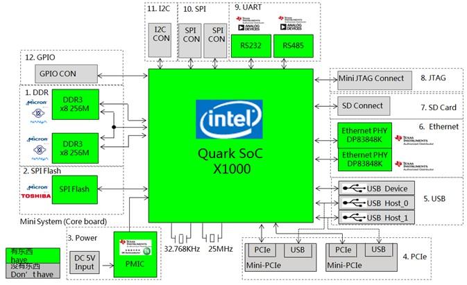 Quark内部集成有一个X86处理器和一个微控制器内核,可编程的微控制器内核,可以帮助系统管理I/O和其他总线功能。X86处理器则负责支持Linux及其他操作系统。