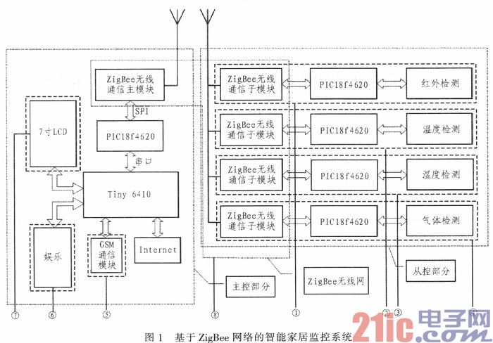 如图1,基于ZigBee网络的无线智能家居监控系统,其特征在于:主控端所述的控制主要硬件包括Tiny6410核心板、ZigBee模块、GSM模块和7寸电阻触摸屏;用户可以通过远程的Internet服务器登录到本系统中的主控制器界面上,实现远程监控家居信息的功能,当家里有遇到什么危险或者是突发情况的时候,还可通过如图所示的GSM模块发送短