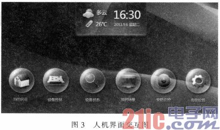 系统采用虚拟QT进行实时人机界面的开发,它是一款GUI设计软件,只需要在一个平台上面设计好,即可在其它平台上面直接移植运行,具有较好的平台适应性。开发的应用程序清晰美观,非常适合于嵌入式系统人机交互界面的开发。底层通过PIC单片机采集温度、湿度等传感器信息,通过ZigBee技术组网并传送数据到人机交互界面,方便及时监控系统的运行状态。系统基于ARM硬件平台上的液晶界面运行效果如图3所示。