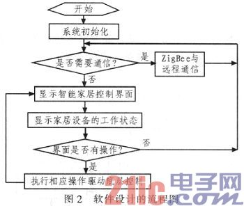 系统主控芯片为ARM内核Tiny 6410控制器,负责整体系统的运行控制、驱动调配与界面管理;底层采用PIC公司的PIC18F4620控制器,驱动无线通信模块,以ZigBee技术组网,负责主从节点间的通信,同时执行终端控制界面下达的任务。系统软件设计的整体流程如图2所示。