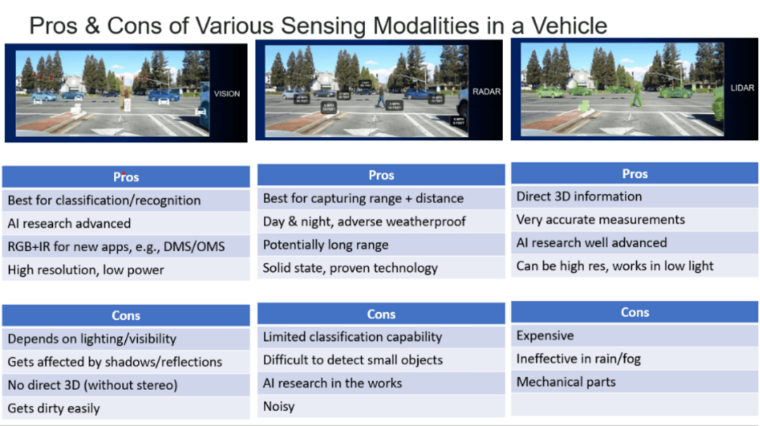 「每种类型的传感器都有局限性,」Kouthon 说。「照相机在物体识别方面非常出色,但提供的距离信息很差,而且图像处理需要大量的计算资源。相比之下,激光雷达和雷达提供出色的距离信息,但清晰度差。此外,激光雷达在恶劣的天气条件下不能很好地工作」。