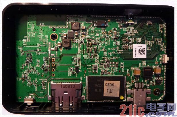 左侧较小防护罩下方是Atheros公司的AR9374双频段802.11a/b/g/n Wi-Fi控制器。右侧较大的防护罩包含两个知名的IC:Cavium的PureVu CNW6611L SoC及SDRAM。FCC提供的照片显示该存储器的生产商为Hynix。但是,这些图片还不足以使我们辨别产品外包装上的产品名称及DRAM密度信息。Cavium的CNW6611L系统框图则清楚地显示其为DDR3存储器。