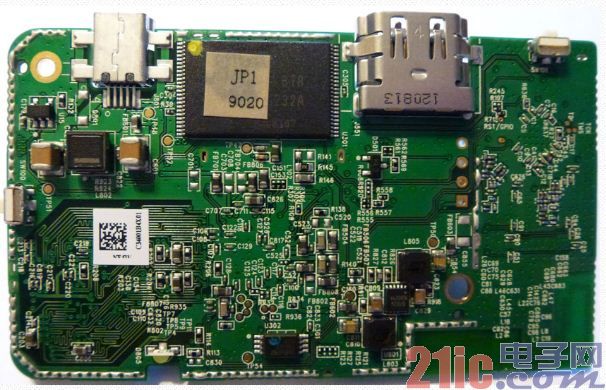 图(e)是将PCB旋转180°后的情况。位于顶部microUSB和HDMI连接器中间、贴有ROM码标签的IC是Hynix H27U1G8F2BTR-BC 1Gb NAND闪存。由于在NAND闪存之外无法直接执行代码,因此,我会在系统中找到RAM(当然,也有助于数据存储)。因此,我将PCB翻转过来(图(f)),发现的唯一可见的知名器件为德州仪器公司的TPD12S521 HDMI ESD IC。我本来也可以撬开法拉第笼的顶部,但这样会导致PTV3000无法继续使用,而未来我还准备将它用于其他测试中。幸运的是,WikiDevi网站一如既往地提供了参考信息。除了直接为我们提供一份部分器件列表外,WikiDevi还提供了包含金属防护罩下方照片的FCC认证数据库页面链接。
