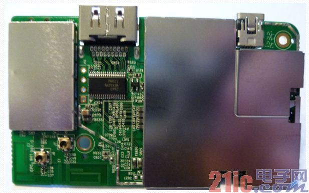 图(d)上方显示的是LED指示灯,其右侧是WPS开关。图(d)下方从左到右依次为复位开关、HDMI连接器、microUSB电源连接器及另一个十字头螺丝。将该螺丝卸下则可将PCB从外壳上取下。