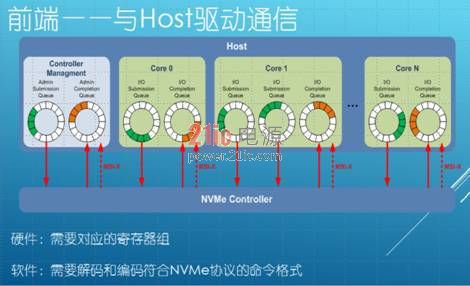 前端提供访问接口和协议,跟主机驱动通信,利用标准格式输配到系统里面,接收主机端发过来的指令,即完成、实现对应的SAS/SATA target协议端或者NVMe协议端,获取Host发出的IO指令并解码和生成内部私有数据结构等待执行。如果遵从NVMe标准,包括提交命令的方法、完成命令的处理方法等都定好了,包括各种队列、队列深度,Queue Pair的总体数量最大可以达到64K个,队列深度也可达64K个,所以,系统里同时可能存在64K×64K IO排着,但是目前的系统是用不到这么多Queue的,因为底下的介质速度还不足以支撑。