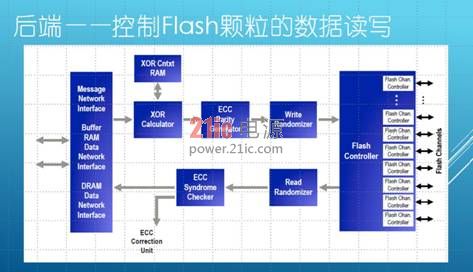 后端Flash控制器,通过一定数量的通道连Flash颗粒,