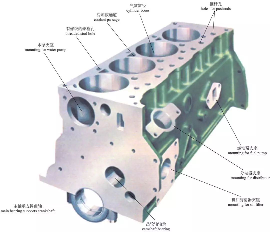 气缸体 气缸体是发动机的主体,它将各个气缸和曲轴箱连成一体,是安装活塞、曲轴以及其他零件和附件的支承骨架。