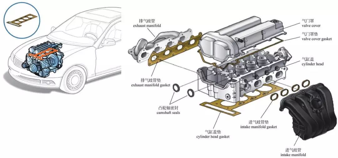 气缸垫 气缸垫位于气缸盖与气缸体之间,其功用是填补气缸体和气缸盖之间的微观孔隙,保证结合面处有良好的密封性,进而保证燃烧室的密封,防止气缸漏气和水套漏水。