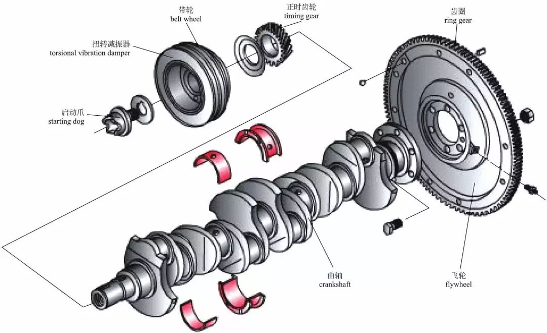 曲轴飞轮组 曲轴飞轮组包括曲轴、飞轮、扭转减振器、平衡轴。曲轴飞轮组的作用是把活塞的往复运动转变为曲轴的旋转运动,为汽车的行驶和其他需要动力的机构输出扭矩;同时还储存能量,用以克服非做功行程的阻力,使发动机运转平稳。
