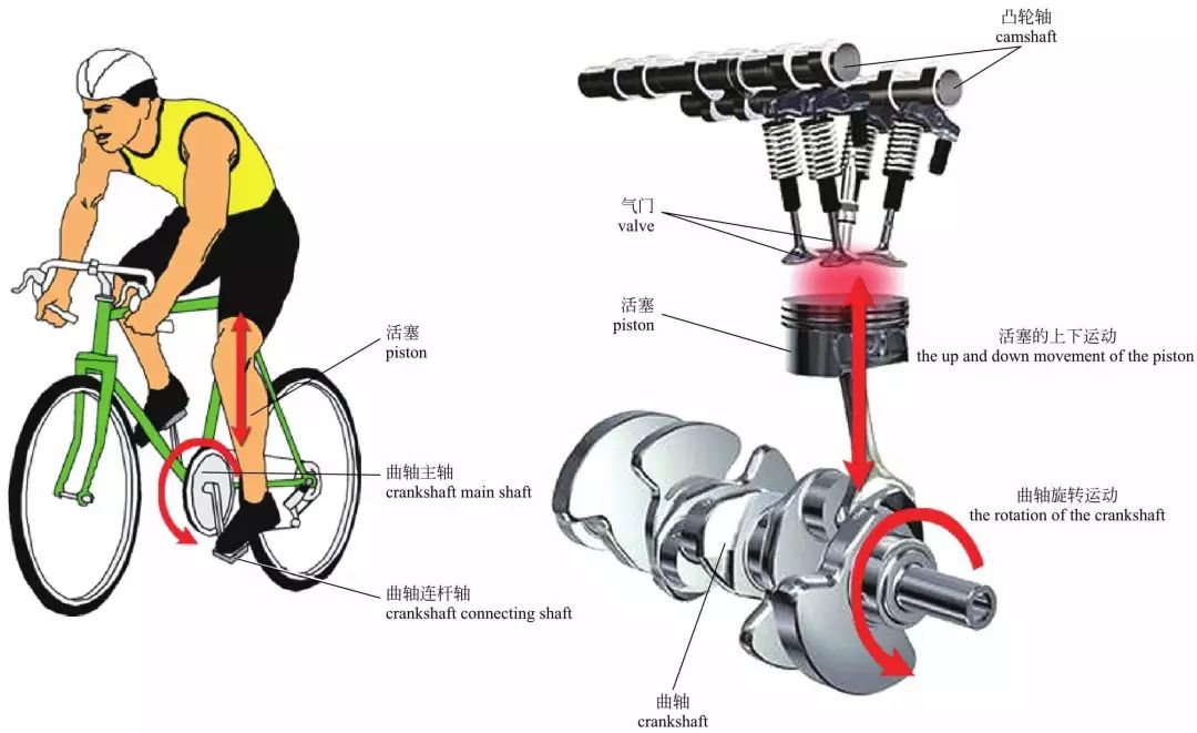 曲轴工作原理 这个运动原理其实跟我们踩自行车非常相似,两个脚相当于相邻的两个活塞,脚踏板相当于连杆轴,而中间的大飞轮就是曲轴的主轴。左脚向下用力蹬时(活塞做功或吸气向下做运动),右脚会被提上来(另一活塞压缩或排气做向上运动)。这样周而复始,就有直线运动转化为旋转运动了。