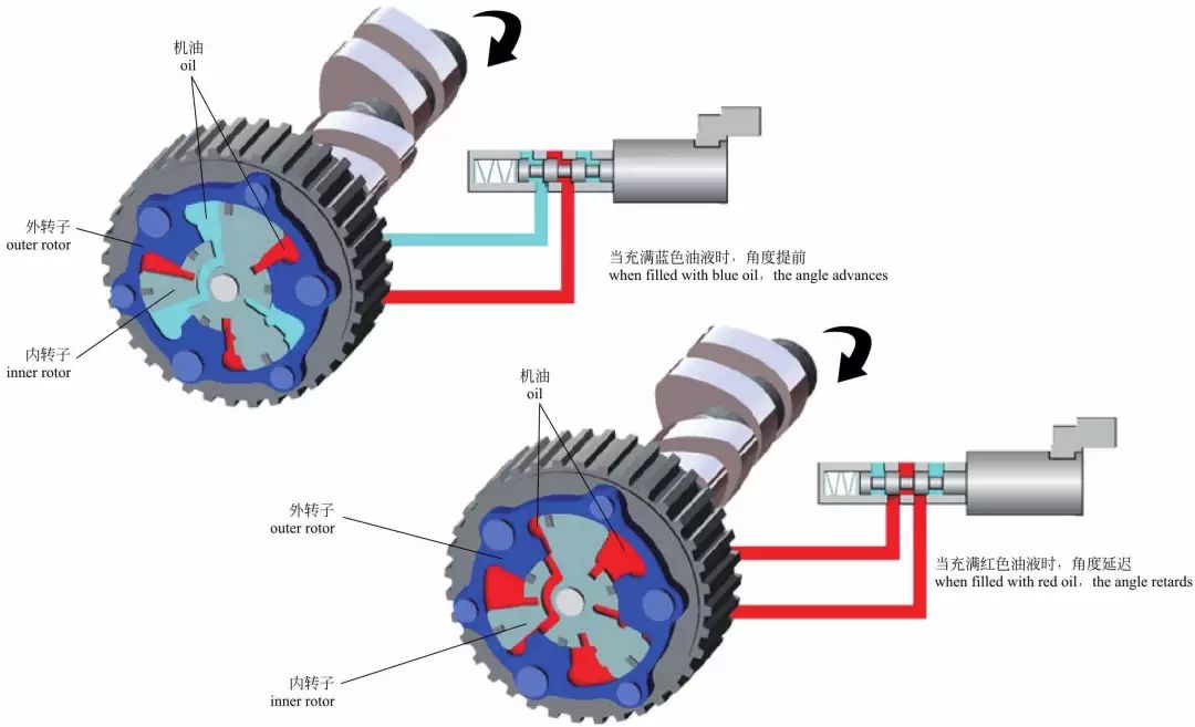 丰田智能可变气门正时系统 凸轮轴的正时齿轮的外转子与正时链条(皮带)相连,内转子与凸轮轴相连。外转子可以通过机油间接带动内转子,从而实现一定范围内的角度提前或延迟。